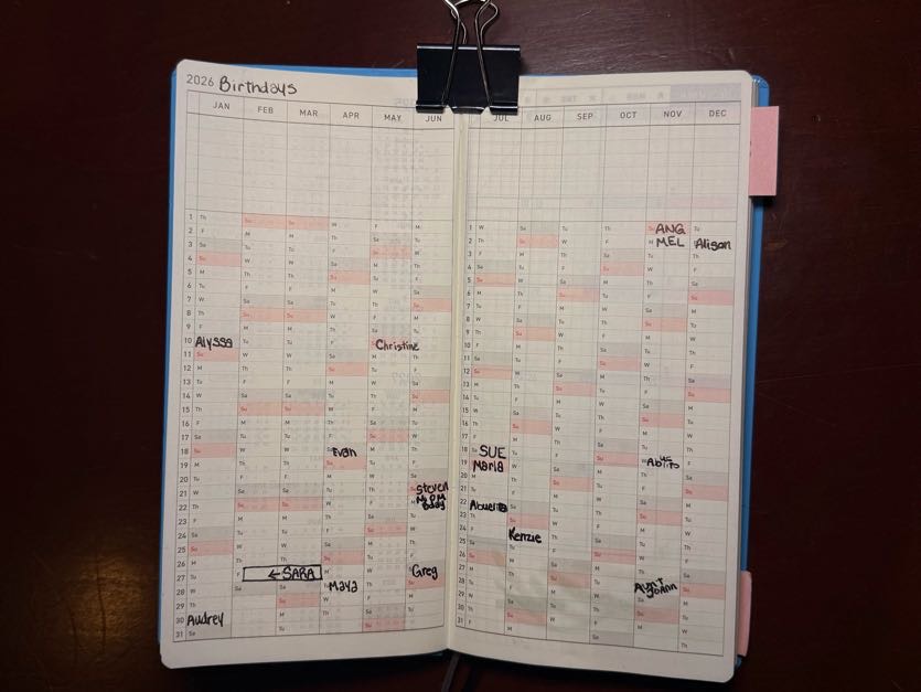 One page in and BAM, you’re already faced with the entire year, all 12 months. Each has a few lines and a box for each day, void of instructions — an ambiguity that gives permission to customize for needs-led visual decluttering. This is where I decided I’d chronicle birthdays, so I can quickly lift the cover and discover whose celebration to prepare for next.