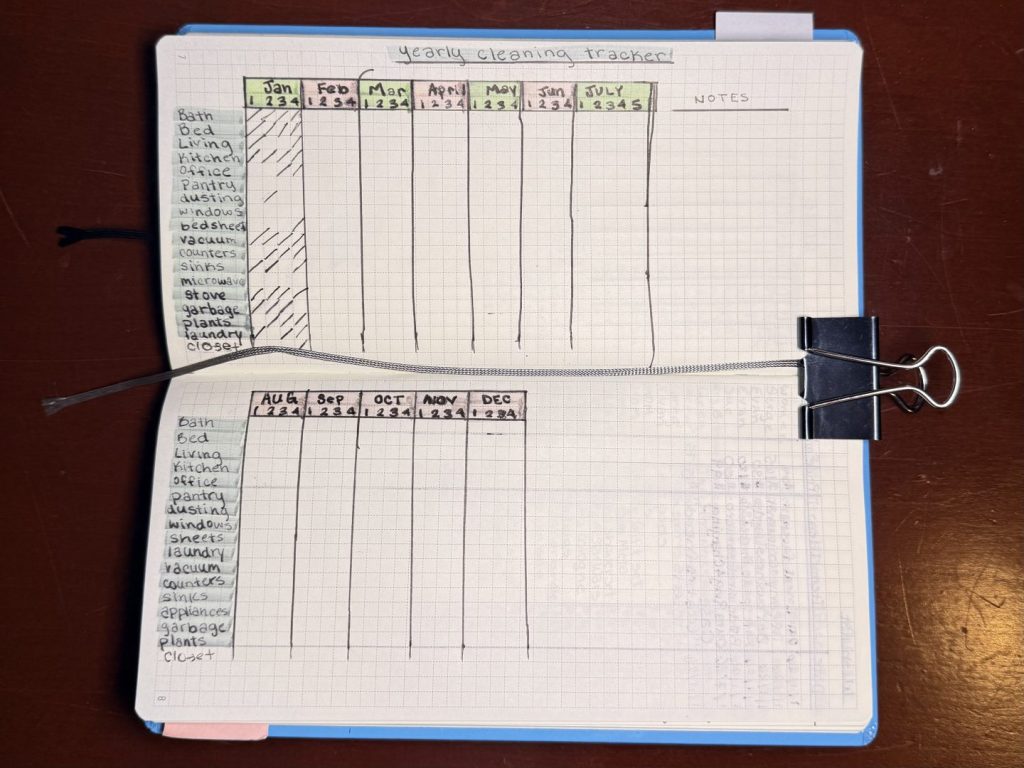 You’ll notice that there are two strings hanging from the planner. Yes, they’re bookmarks — presumably intended for marking the relevant month and week at any given time, but I’ve decided to mark my month with a post-it tab, leaving one string for the current week and the other for a special and necessary page: my cleaning log.